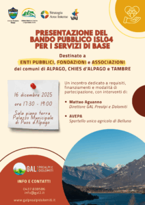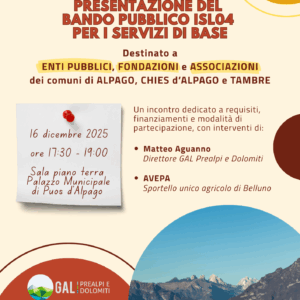 Per illustrare i contenuti del bando e le modalità di partecipazione, il GAL Prealpi e Dolomiti in collaborazione con AVEPA di Belluno organizza un incontro pubblico martedì 16 dicembre 2025, dalle ore 17:30 alle 19:00, presso la sala al piano terra del Palazzo Municipale di Puos d’Alpago. Durante l’incontro interverranno il Direttore del GAL, Matteo Aguanno e AVEPA, Sportello unico agricolo di Belluno.
