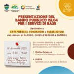 Al via il bando ISL04 SNAI per potenziare i servizi di base nell’Area Alpago–Zoldo Come migliorare la qualità della vita nelle nostre comunità e rafforzare i servizi di prossimità? Il nuovo bando ISL04 “Investimenti non produttivi nelle aree rurali”, promosso nell’ambito della Strategia Nazionale Aree Interne (SNAI) dell’Area Alpago–Zoldo, è pensato proprio per questo: sostenere[…..]