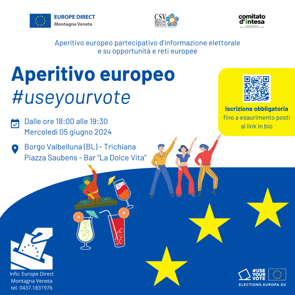 La sinergia tra EUROPE DIRECT Montagna Veneta e il CSV Treviso-Belluno continua! Dopo l’ottima riuscita dell’aperitivo europeo di fine 2023, organizzato nell’ambito della rassegna europea di tre giorni promossa dal nostro centro, torniamo a proporre un’iniziativa insieme al CSV nel territorio della Montagna Veneta! Non prendete impegni per il prossimo 5 giugno, perché, con la collaborazione del Comitato d’Intesa di Belluno, vi proponiamo l’APERIVOTE!