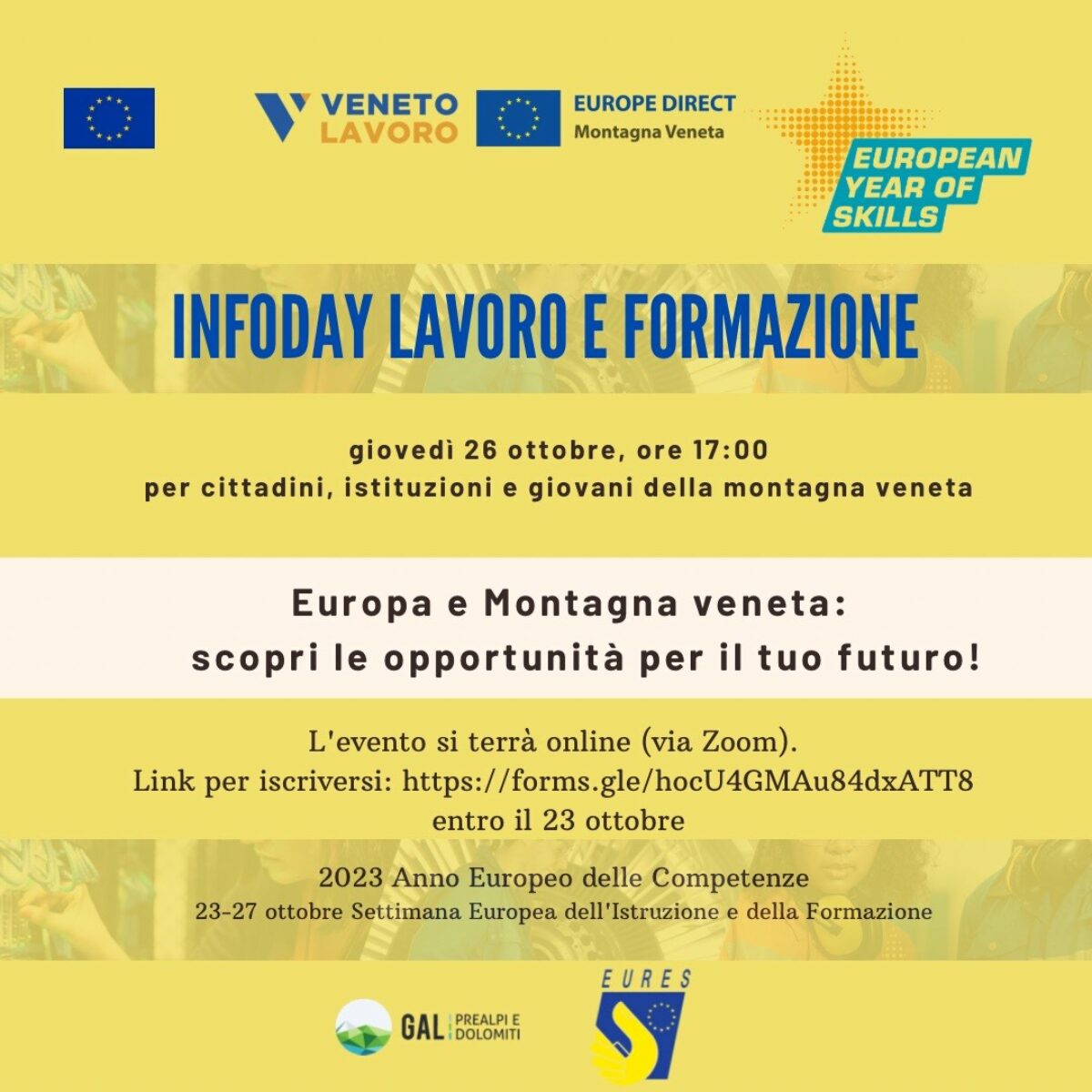 Giovedì 26 ottobre alle ore 17.00 si terrà un incontro informativo organizzato dal centro EUROPE DIRECT Montagna Veneta del GAL Prealpi e Dolomiti e da Veneto Lavoro, ED partner, sul tema del lavoro e della formazione.
