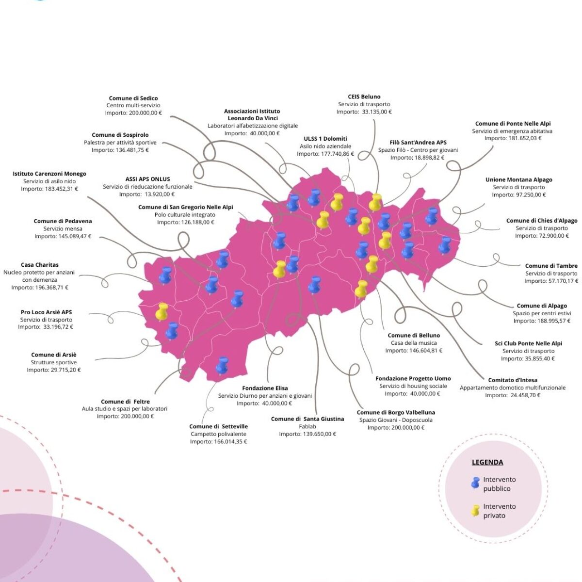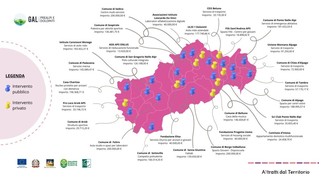 - Miglioramento di strutture/infrastrutture per servizi culturali e ricreativi, finalizzati alla socializzazione e alla coesione della comunità (spazi giovani, spazi Filò, Fablab, Casa della Musica, ecc.): 10 progetti finanziati per un totale di 957.302,73 €;