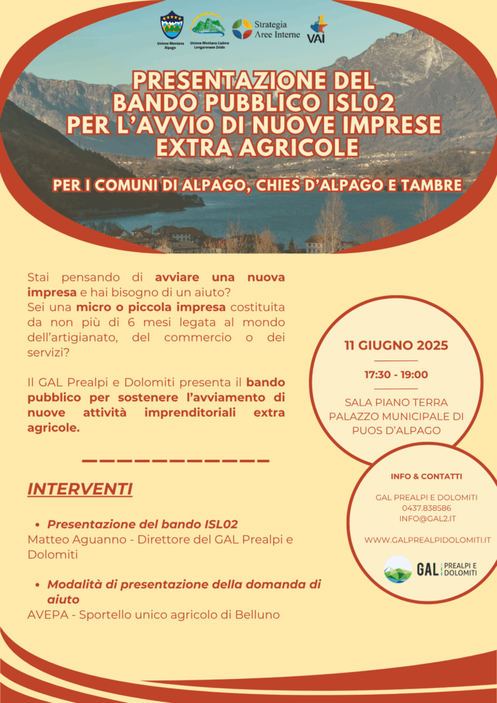 Nell’ambito della Strategia Nazionale Aree Interne (SNAI) per l’Area Alpago-Zoldo, il GAL Prealpi e Dolomiti presenta il bando pubblico di prossima pubblicazione per sostenere l’avviamento di nuove attività imprenditoriali extra agricole.