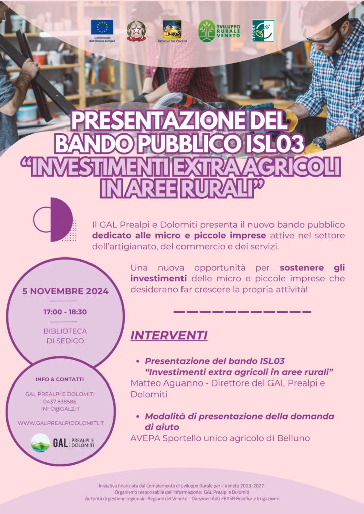 Il GAL Prealpi e Dolomiti vi invita alla presentazione del nuovo Bando Pubblico ISL03 “Investimenti extra agricoli in aree rurali” dedicato a micro e piccole imprese attive nel settore dell’artigianato, del commercio e dei servizi. L’obiettivo è accrescere l’attrattività delle aree rurali, contrastandone il progressivo spopolamento e creando nuova occupazione.