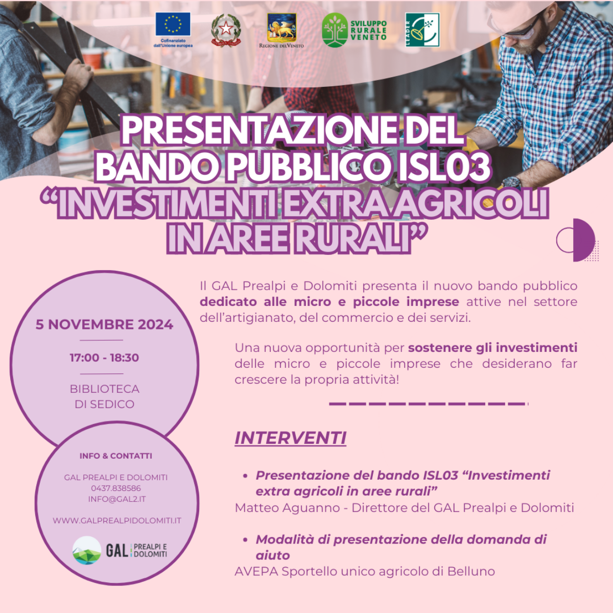 - Intervento di apertura: Matteo Aguanno, Direttore del GAL Prealpi e Dolomiti, presenterà il bando ISL03 “Investimenti extra agricoli in aree rurali”.
