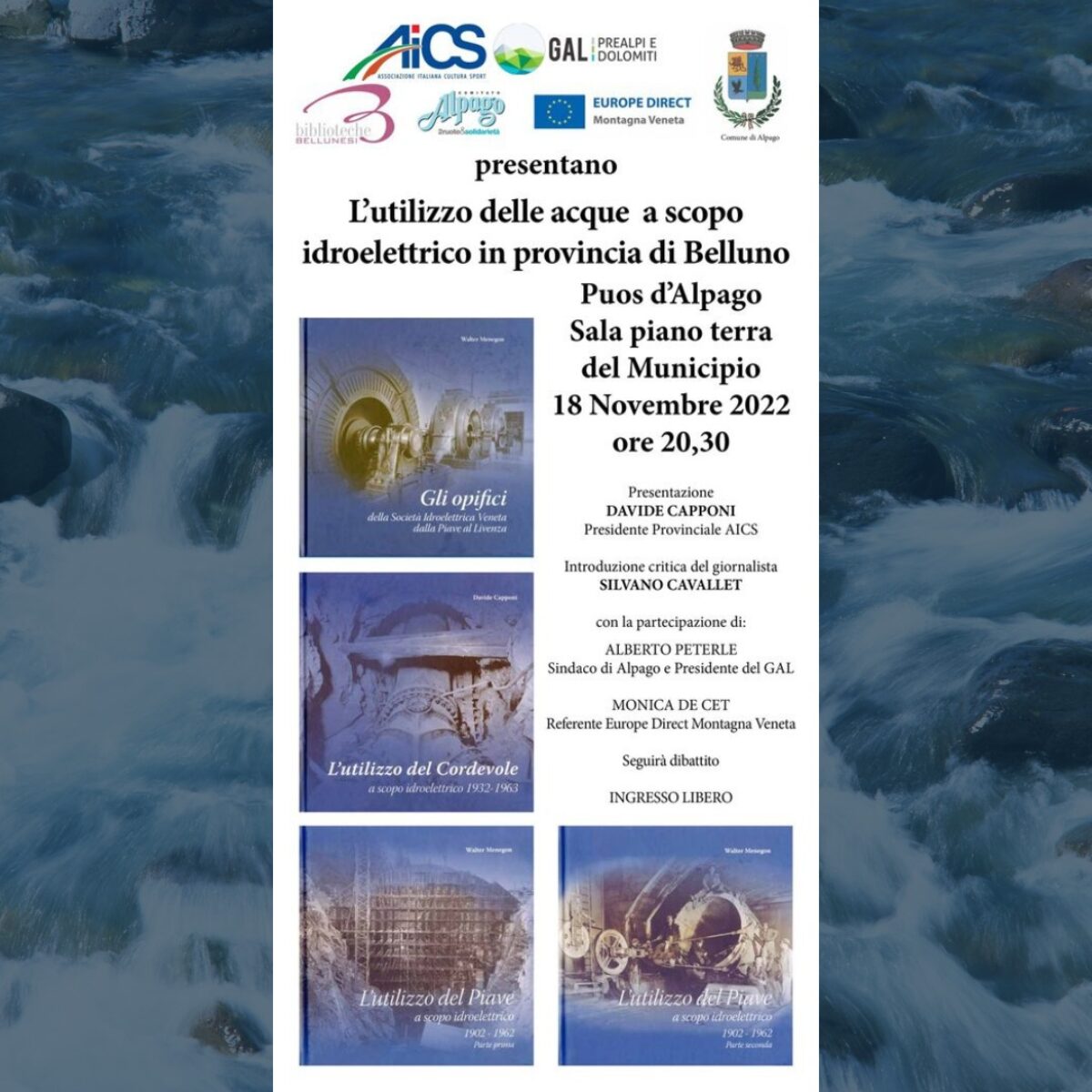 Vi segnaliamo l’iniziativa del 18 Novembre 2022 ore 20,30 con titolo “L’utilizzo dell’acque a scopo idroelettrico in provincia di Belluno” che si terrà presso la Sala piano terra del Municipio di Puos d’Alpago (scarica qui il programma della serata) organizzata da AICS Belluno, Comitato Alpago 2 Ruote, Comune di Alpago e Biblioteche Bellunesi. Anche il nostro Europe Direct, insieme al GAL Prealpi e Dolomiti, sarà presente per un breve intervento di presentazione del centro e per invitarvi alla fine dell’iniziativa a passare presso il nostro info-point, rivolto a tutti voi partecipanti, dove è possibile richiedere gratuitamente le pubblicazioni ufficiali dell’UE. In particolare, si segnala la presenza di materiale divulgativo dell’UE anche sul tema “acqua” in una prospettiva europea. Presso lo stand sarà possibile lasciare i propri riferimenti per essere iscritti alla newsletter del centro, qualora ci sia interesse nel ricevere le news dal centro e richiedere informazioni sulle iniziative che faremo nel corso di quest’anno, ma anche le nuove attività 2023.
