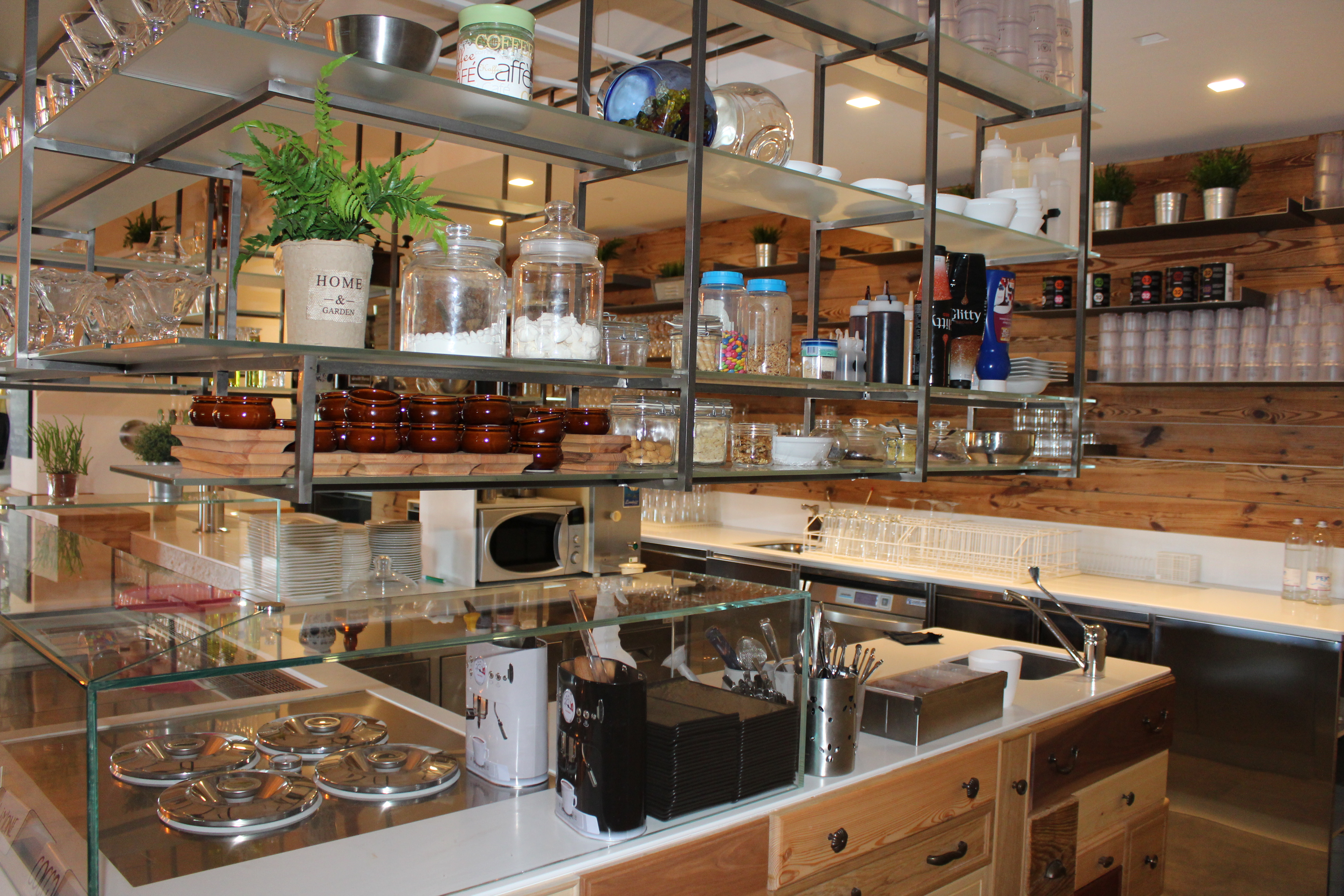 Realizzazione di una postazione dessert/gelati a vista: postazione a cubo a vista progettata su misura, con gelateria a pozzetti con refrigerazione a glicole.