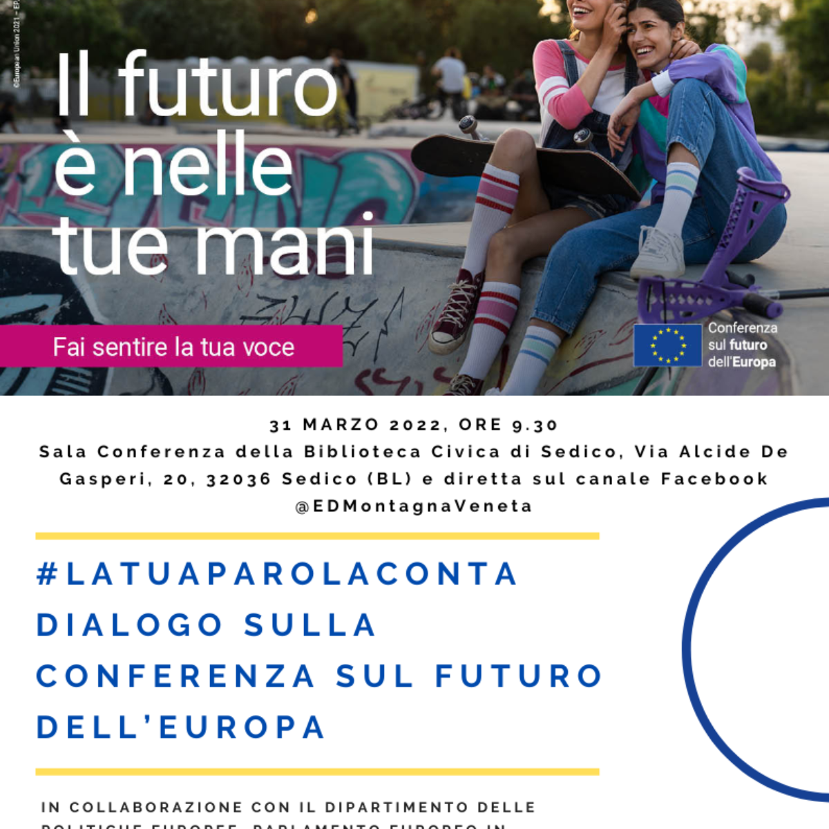 Il giorno 31 marzo 2022 presso la Biblioteca di Sedico alle ore 9.30 il nostro centro EUROPE DIRECT Montagna Veneta realizzerà in collaborazione con il Dipartimento delle Politiche europee, Parlamento europeo in Italia e Rappresentanza in Italia della Commissione europea l’evento “#latuaparolaconta. Dialogo sulla Conferenza sul Futuro dell’Europa”.
