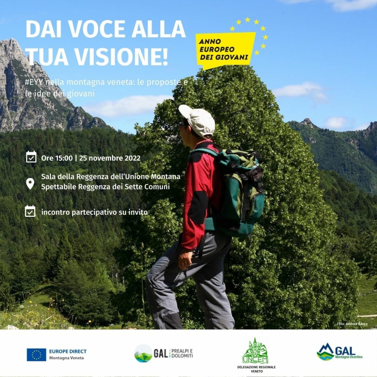 L’iniziativa si compone di una serie di incontri partecipativi in alcuni luoghi-simbolo della montagna veneta rivolti alle giovani generazioni ed è volta a far conoscere ai giovani la piattaforma europea EYY- European Year of Youth nonché le opportunità offerte da quest’ultima e dai centri EUROPE DIRECT. Allo stesso tempo, l’obiettivo del percorso è quello di far riflettere i giovani delle aree montane su alcune tematiche significative per questi territori, nonché di motivarli per la ricerca e la proposta di idee e soluzioni da realizzare nel proprio contesto locale. Le aree rurali-montane sono infatti – come ben sappiamo – dei territori fragili, con marcate caratteristiche di marginalità, squilibrio demografico e diversificazione economica, in cui spesso si rileva una scarsa attrattività dei servizi (culturali, ricreativi, sociali) offerti ai cittadini, in particolar modo più giovani.
