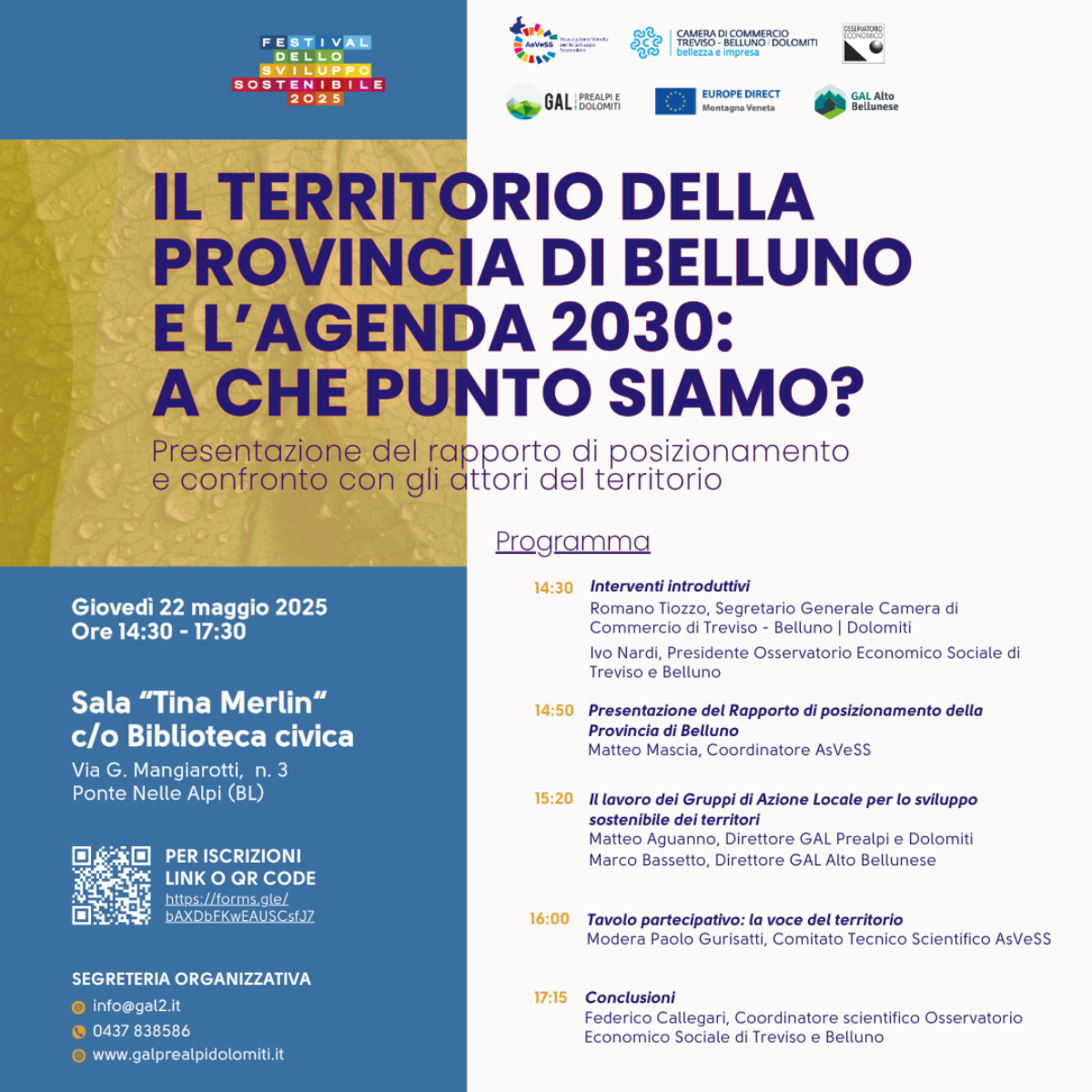 Giovedì 22 maggio alle ore 14:30, presso la sala “Tina Merlin” di Ponte Nelle Alpi, si terrà l’incontro “Il territorio della Provincia di Belluno e l’Agenda 2030: a che punto siamo?” durante il quale verrà presentato il Rapporto di posizionamento del territorio della provincia di Belluno rispetto agli Obiettivi di Sviluppo Sostenibile dell’Agenda 2030.